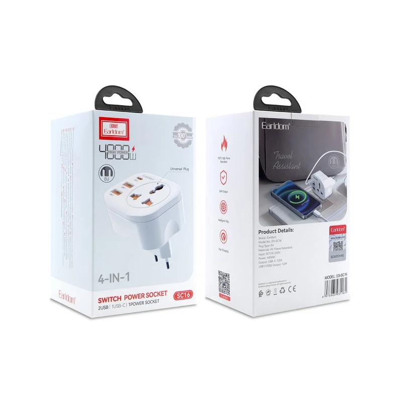 بدیل برق و شارژر ارلدام مدل Switch Power Socket SC16 با امکان تبدیل 3 شاخه به دو شاخه و همچنین دارای 2 پورت یواسبی و 1 پورت تایپسی امکان شارژ چند دستگاه را به صورت همزمان برای شما فراهم می کند. تبدیل 3 به 2 آن توان 4000 وات و 10 آمپر را دارد که بسیار مناسب و با کیفیت است و شارژرهای USB و USB-C آن از توان 12 وات 2.4 آمپر برخورداند و بیشتر برای شارژ گجت های الکترونیک مانند ایرپاد ، ساعت هوشمند ، هدفون و … یا گوشی های نسبتا قدیمی مانند گوشی های ساخته شده تا سال 2020 مناسب هستند و برای گوشی های جدید متاسفانه از فناوریهای شارژ سریع پشتیبانی نمی کند و با شارژ آهسته تر آن ها را شارژ می کند . بدنه چند راهی برق SC16 را مواد بسیار مرغوب و نسوز پلی کربنات تشکیل داده است که در برابر حرارت و آتش سوزی بسیار مقاوم است .