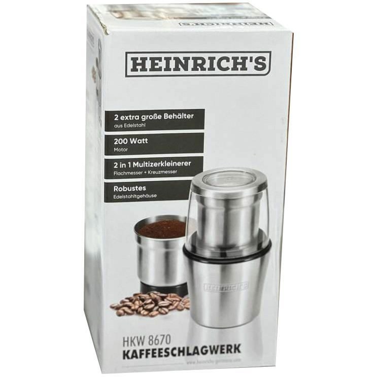 آسیاب دوقلوی هنریچ مدل HKW 8670 با توان مصرفی 200 وات و تیغه های 2 پره برای آسیاب دانه های قهوه و تیغه های 4 پره برای آسیاب انواع آجیل و ادویه جات محصولی پرکاربرد مناسب مصارف خانگی و روزمره می باشد.بدنه آسیاب از جنس استیل ضد زنگ و بادوام و جنس تیغه های از استیل و فولاد می باشد که بر اثر مرور زمان و استفاده کند نخواهد شد، سیستم امنیتی قوی، درپوش شیشه ای، پایه ضد لغزش از دیگر ویژگی های مهم این محصول می باشد.