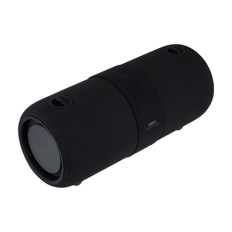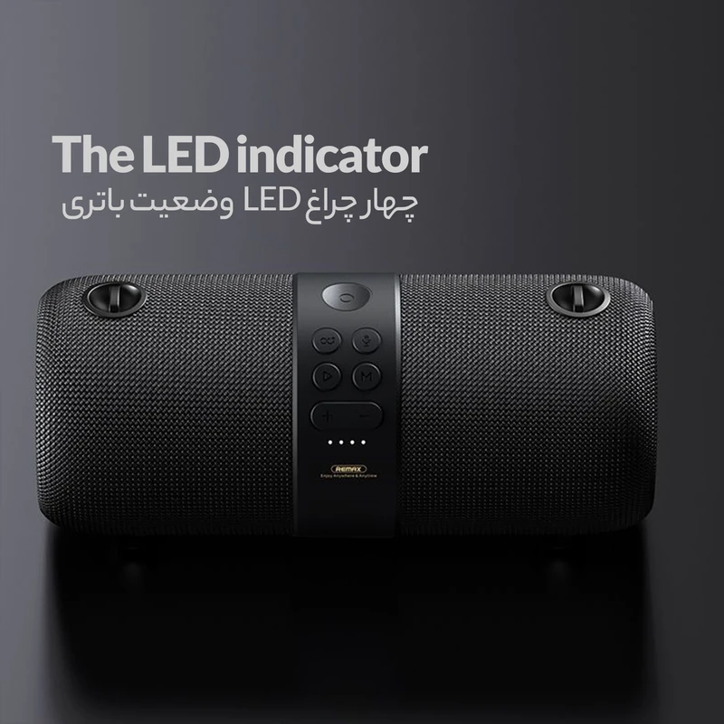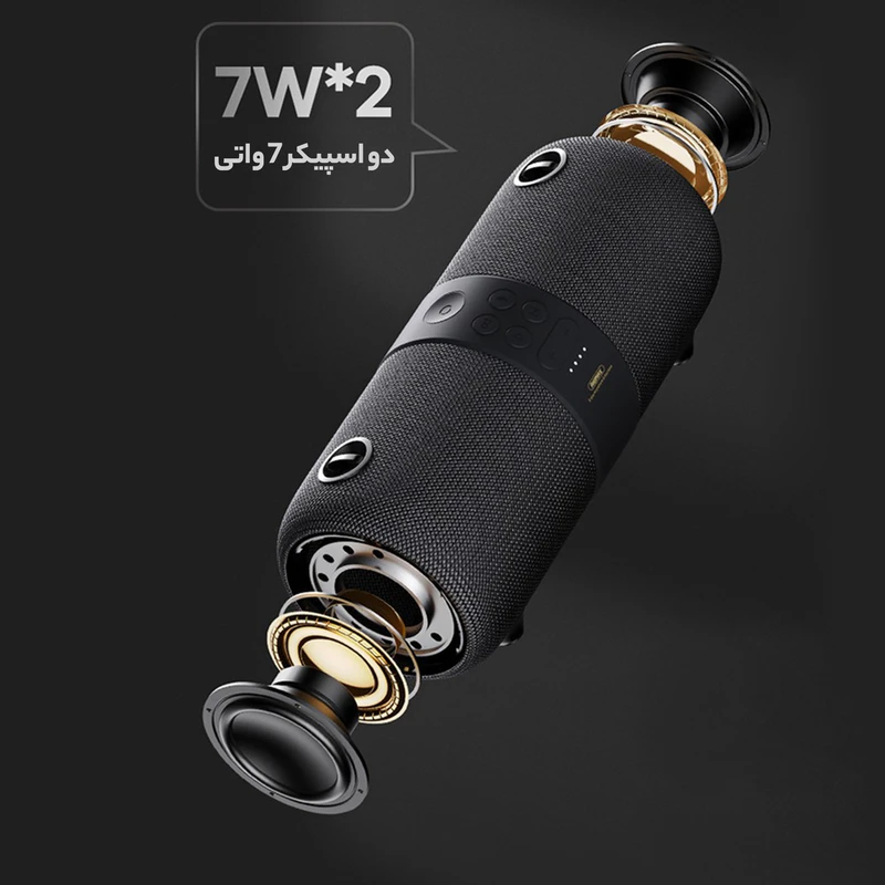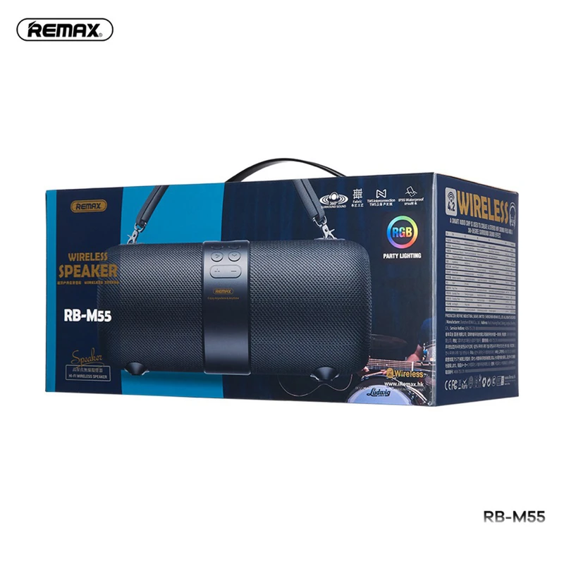 کمپانی ریمکس در دنیای اسپیکرها هم تنوع محصول بالایی دارد و برای هر طیف سلیقه و یا کاربری یک محصول ویژه و متفاوت طراحی و تولید کرده است! اسپیکر بلوتوثی قابل حمل ریمکس مدل RB-M55 یکی از خوش ساخت ترین و با کیفیت ترین اسپیکرهای ساخته ریمکس است که ویژگی های جذابی دارد! ابتدا از اندازه و طراحی محصول شروع کنیم: RB-M55 به شکل یک استوانه افقی طراحی شده و از متریال ترکیبی پلاستیک ABS و آلومینیوم و توری های فابریک(پارچه مشبک) ساخته شده ، در قسمت بالا دو پین حلقه ای برای قلاب طراحی شده است تا بوسیله بندی که داخل باکس دستگاه هست بتوان بصورت دوشی و چمدانی حمل کرد! در قسمت وسط یک نوار سیاه پلاستیکی دور استوانه حلقه زده شده و محل قرارگیری دکمه های کار با اسپیکر و 4 چراغ وضعیت باتری اسپیکر است. در قسمت پشتی هم ورودی های دستگاه با یک درپوش سیلیکونی پوشانده شده است که دانگل USB برای حافظه فلش ، جک صدا AUX ، درگاه USB Type C برای شارژ باتری دستگاه و یک دکمه کوچک ریست است. در دوقسمت کناری هم ساب ووفر های اسپیکر قرار گرفته است و دور آن با یک رینگ لایت RGB زیبا با قابلیت DISCO LIGHT تزیین شده تا جلو بسیار زیبایی در هنگام کار با دستگاه ارائه دهد! در مورد کیفیت صدا RB-M55 از دو اسپیکر دوکاناله پرقدرت با توان 7 واتی بهره می برد که در مجموع 14 وات قدرت اسپیکر است. این جفت اسپیکر درایو با قطر مناسب دارند و در مجموع امپدانس 4 اهمی دارند!کیفیت صدا وبیس آن با توجه به مشخصات فنی بسیار خوب بوده و مخاطب را راضی نگه میدارد و تفکیک صدا بخوبی صورت میگیرد! با اتصال به گوشی و میکروفون داخلی ، توانایی مکالمه با اسپیکر و تماس برقرار است. RB-M55 از صدای با کیفیت Hi-Fi پشتیبانی میکند و صدای 360 درجه پخش میکند، نسخه بلوتوث دستگاه 4.2 است و تا محدوده 10 متری بخوبی عمل میکند. مورد جذاب بعدی گواهینامه IPX6 آن است و RB-M55 در مقابل آب کاملا مقاوم است! می رسیم به بخش باتری ؛ RB-M55 از یک باتری با حجم 3600 میلی آمپر بهره می برد که طی 4 ساعت فول شارژ شده و تا 60 ساعت میتواند آماده بکار باشد و 3 الی 5 ساعت هم بسته به نوع پخش و قابلیتها بطور مداوم موسیقی پخش می کند! RB-M55 یک اسپیکر بلوتوثی با امکانات و قابلیتهای پرشماری است که در رده قیمتی خود از بهتریناست!