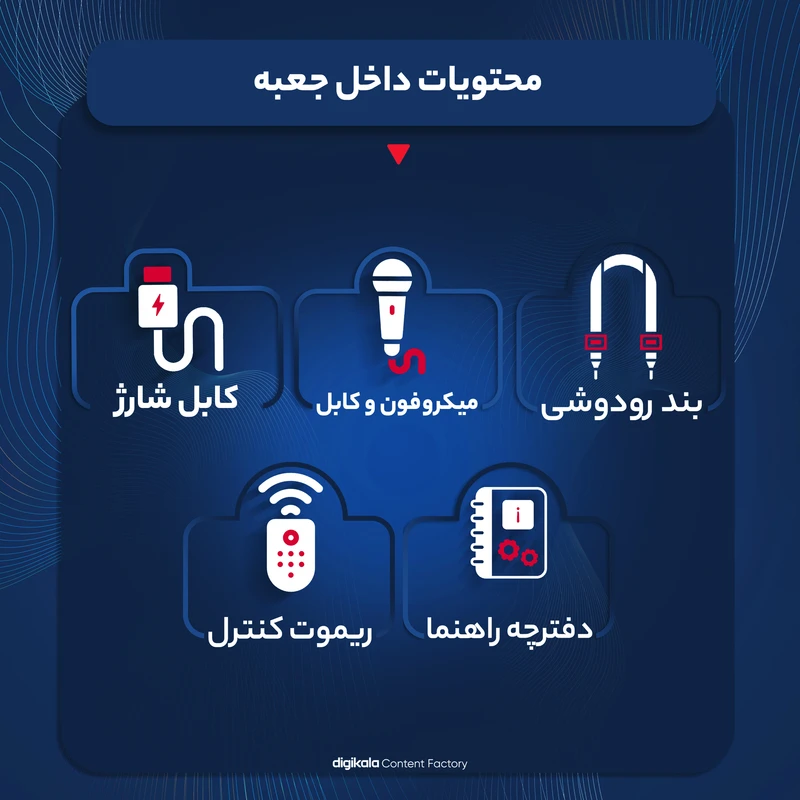 میکروفون و کابل میکروفون / بند دوشی/ دفترچه راهنما/ کابل شارژر/ ریموت کنترل