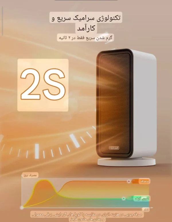 با توان خروجی حدود ۱۵۰۰ وات، این بخاری فضای اتاق خواب، اتاق نشیمن، دفتر کار یا حتی آشپزخانه را در کمترین زمان ممکن گرم می‌کند. فناوری گرمایش سریع سرامیکی (PTC Ceramic Heating) باعث می‌شود در عرض تنها چند ثانیه، هوای گرم و ملایم در محیط جریان یابد. این گرمایش بدون ایجاد شعله باز و کاملاً ایمن انجام می‌شود.