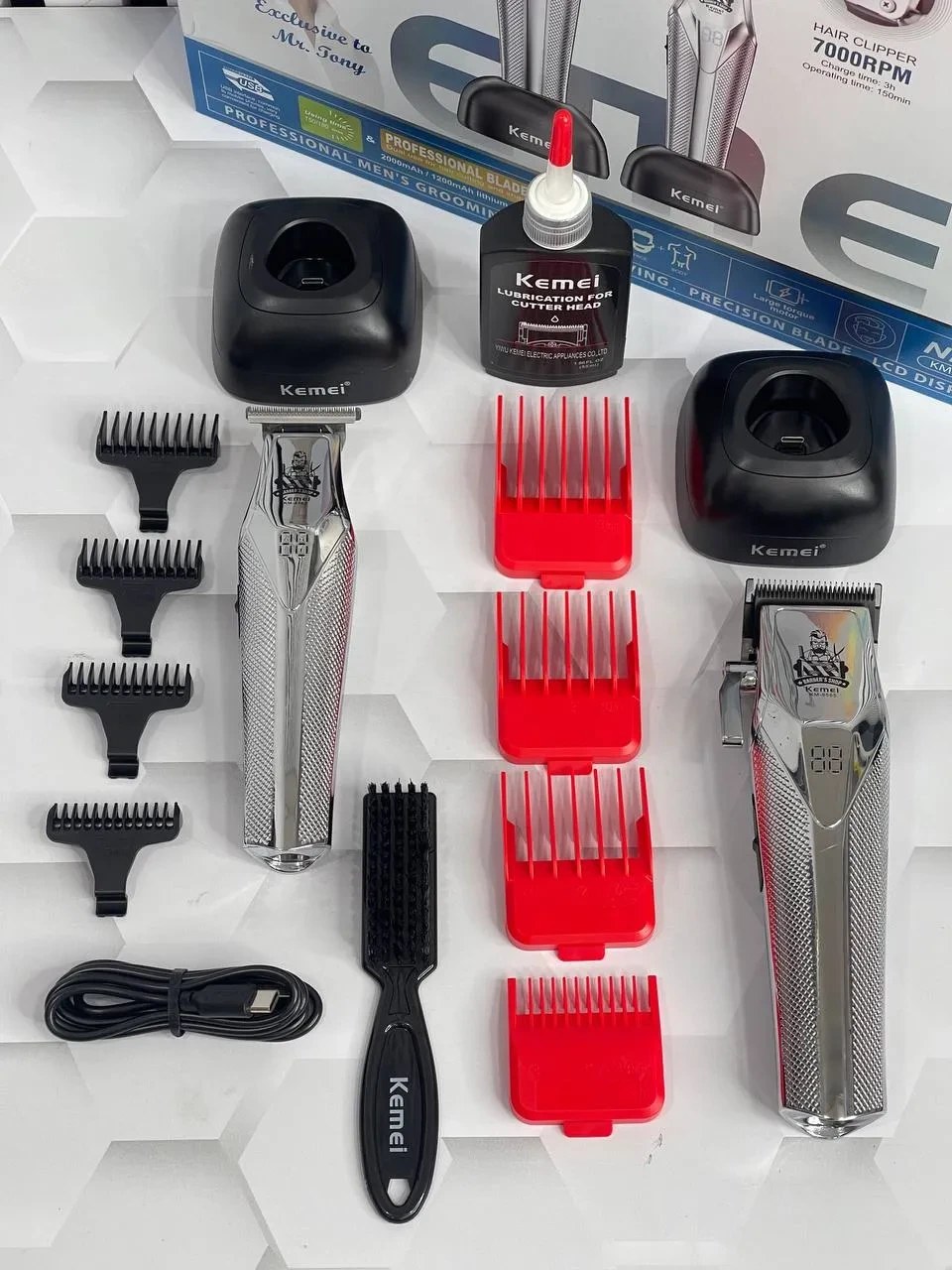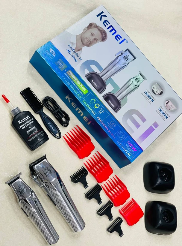 ست 2 قلو فلزی ماشین اصلاح کیمی مدل Kemei KM-8565 با مجموعهای کامل از لوازم جانبی عرضه میشود که شامل موارد زیر است: