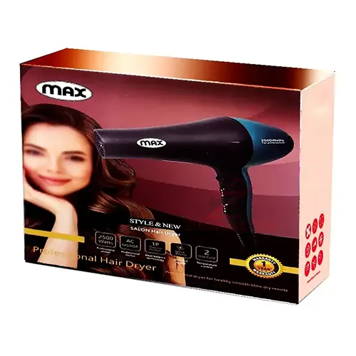 سشوار حرفه ای مکس max مدل 7882 با توان 2500 وات، فناوری تولید یون، تنظیمات حرارت و باد، و طراحی ارگونومیک، مناسب برای استفاده در سالنهای زیبایی و خانگی است.