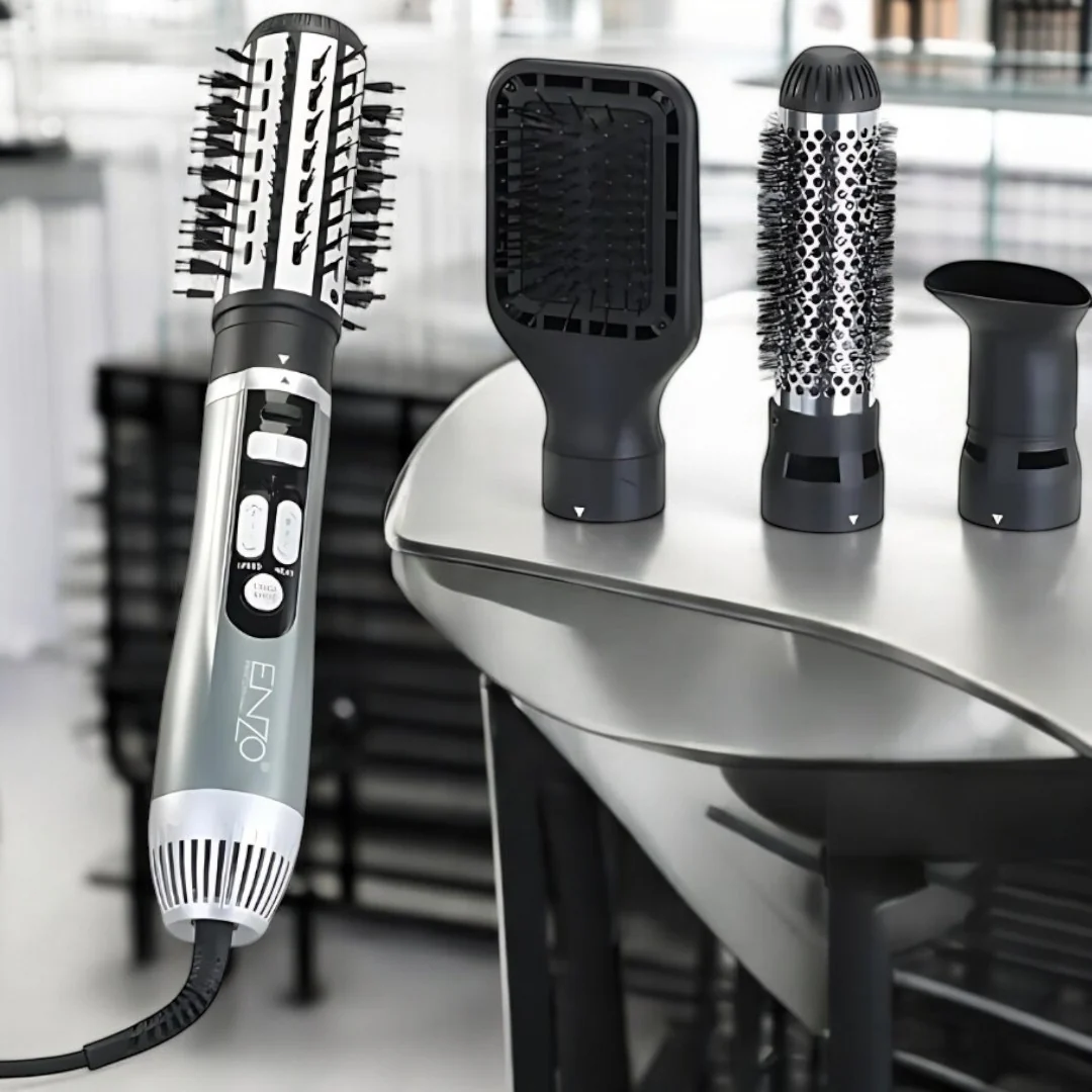 سشوار چرخشی انزو پروفیشینال EN-749 با داشتن 5 سری مختلف، یکی از کاملترین ابزارهای حالتدهی به مو محسوب میشود. این اقلام شامل دو برس گرد باریک و پهن، یک برس تخت و یک سری خشککن است. تنوع این سریها به شما این امکان را میدهد که بهراحتی موهای خود را فر کنید، صاف کنید، حجم دهید یا خشک کنید. این دستگاه یک ابزار همهکاره است که تمام نیازهای شما را در حالتدهی به موها برآورده میکند.