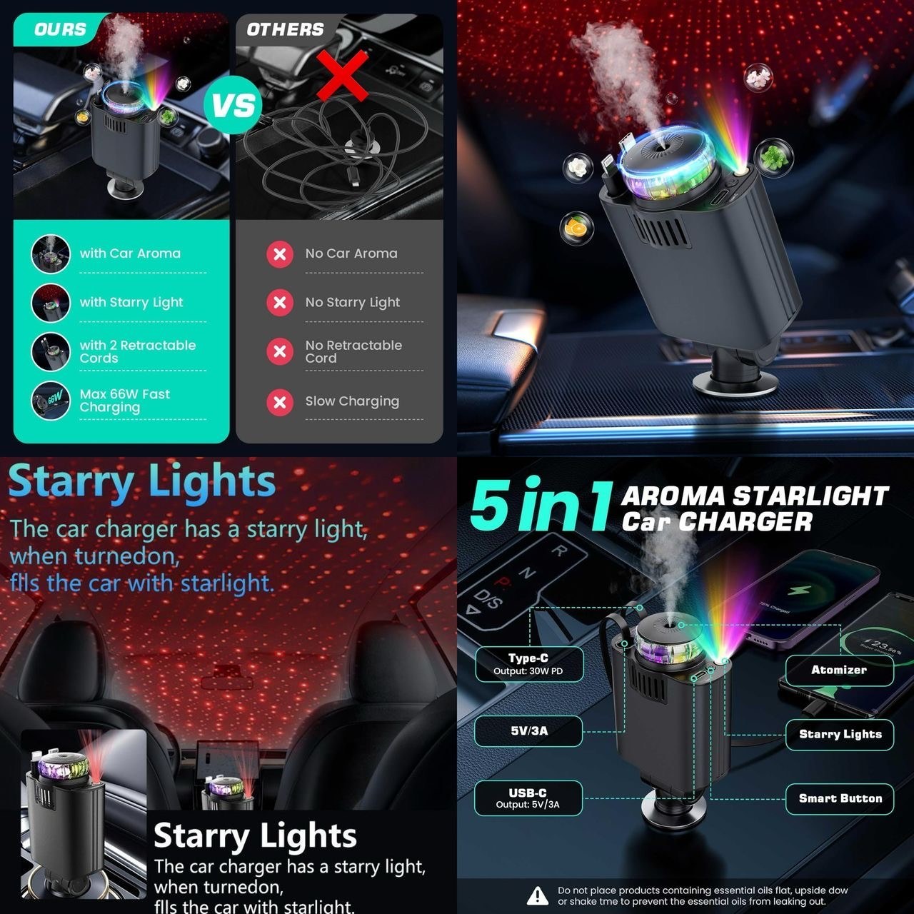 نورپردازی کهکشانی و RGB: با نورپردازی بنفش رنگ طرح ستاره در قسمت بالایی و نورپردازی RGB در بدنه دستگاه، فضایی رمانتیک و جذاب در خودروی خود ایجاد کنید. این افکت نوری در ترکیب با رایحه خوش، به خصوص در سفرها، قرارها و مهمانیها، جلوهای بینظیر به خودروی شما میبخشد.