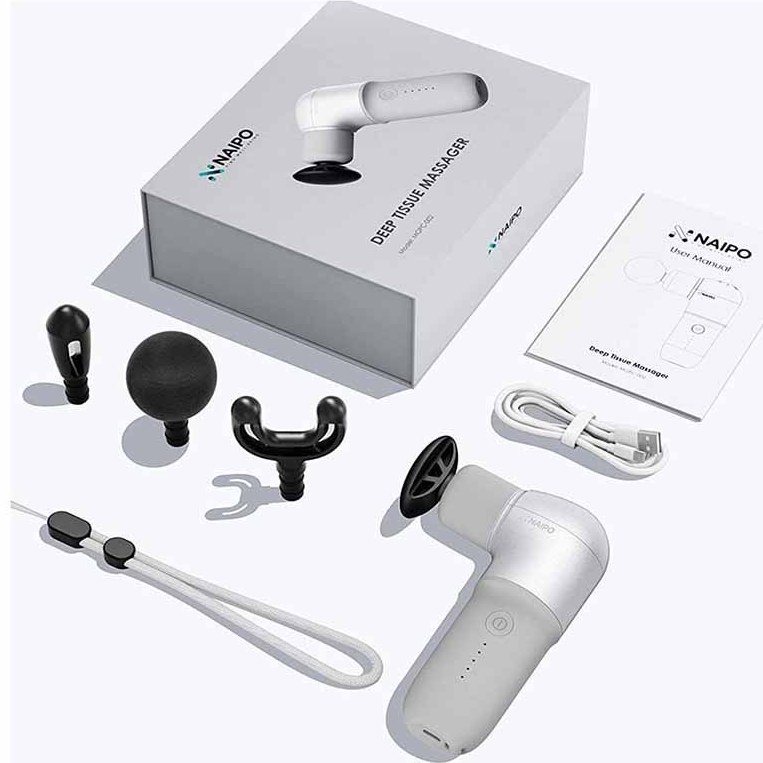 تفنگ ماساژ NAIPO با طراحی سبک و قابل حمل (وزن 0.4 کیلوگرم) و دسته ارگونومیک، امکان استفاده راحت با یک دست را فراهم می‌کند. این دستگاه دارای 5 سرعت و 4 سر قابل تعویضبرای ماساژ هدفمند و عمیق است. با قابلیت تولید تا 3000 ضربه در دقیقه و صدای کمتر از 45 دسی‌بل، ماساژ موثر و آرامی را ارائه می‌دهد. باتری لیتیوم یون آن با ظرفیت 2500 میلی‌آمپر ساعت پس از شارژ کامل حدود دو هفته دوام می‌آورد و از طریق کابل USB-C قابل شارژ است