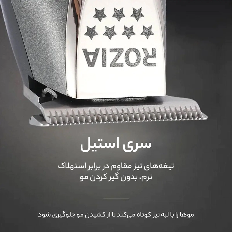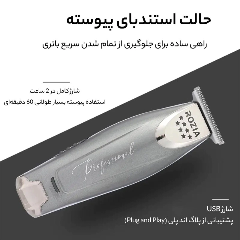 این دستگاه یکی از محصولات مجهز به باتری یونی لیتیومی می باشد که به صورت بسیار قوی برای آن طراحی شده که پس از مدت زمان یک و نیم ساعت شارژ دستگاه شما این امکان را میدهد تا بتوانید دو ساعت از آن بهره ببرید این یعنی مدت زمان کافی برای ایجاد هر نوع اصلاح ای که بخواهید این محصول فوق العاده علاوه بر باتری طراحی بسیار مدرن نیز دارد یعنی دسته آن کاملا ارگونومیک می باشد و در دست جا میگیرد به خوبی قابل استفاده و حمل و جابجایی است. این محصول قابلیت های مانند اصلاح با شماره صفر و همچنین قابلیت خط زنی را دارد و شما می توانید به بهترین نحو ممکن است آن بهره ببرید چرا که یکی از محصولات حرفهای کمپانی روزیا می باشد و به همراه این دستگاه شانه در سایزهای مختلف جهت استفاده، روغن روان کننده تیغه های دستگاه که از جنس استیل ضد زنگ پایدار می باشد و به کمک روغن به نحو بهتری کار میکند و همچنین کابل شارژ و سه عدد شانه مختلف جهت اصلاح بهتر با این محصول طراحی شده تا به شما این امکان را دهد بتوانید در هر جا و هر مکانی هر مدل اصلاحی که بخواهید با این دستگاه داشته باشید و همیشه آراسته و زیبا باشید
