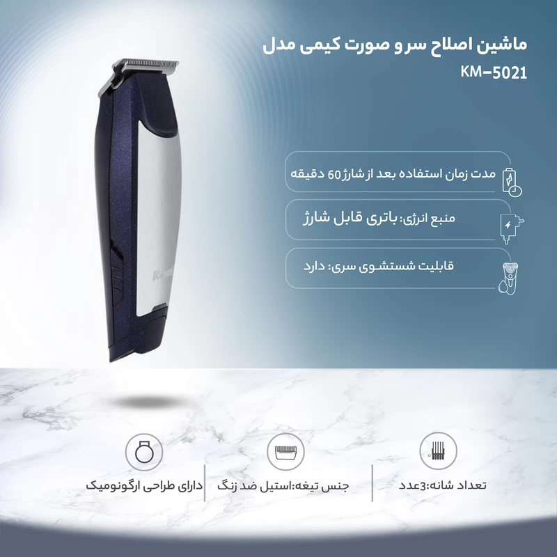 ست 2 قلو فلزی ماشین اصلاح کیمی مدل Kemei KM-8565 با مجموعهای کامل از لوازم جانبی عرضه میشود که شامل موارد زیر است: