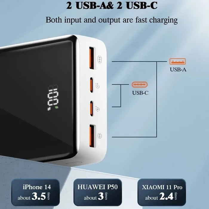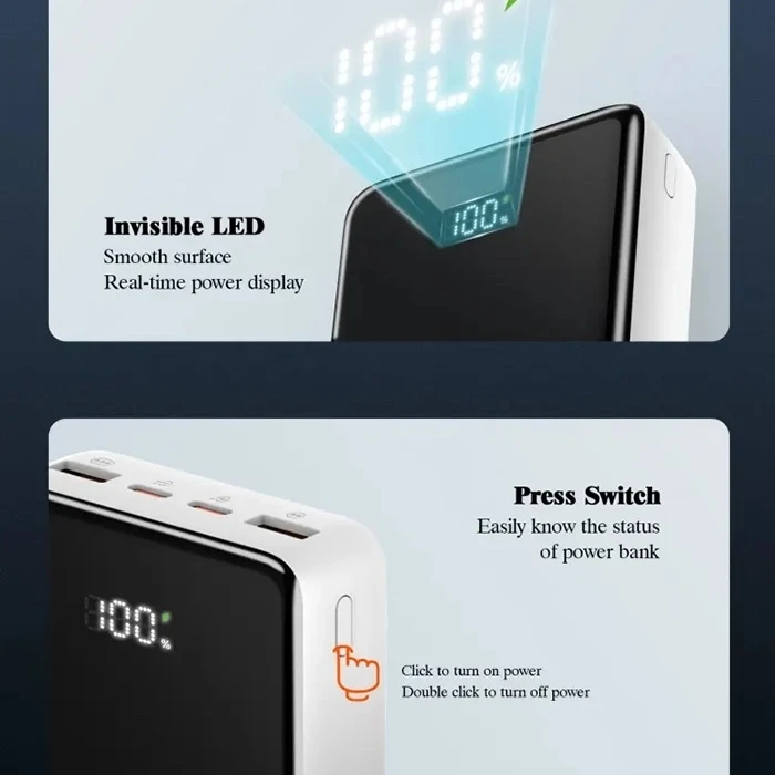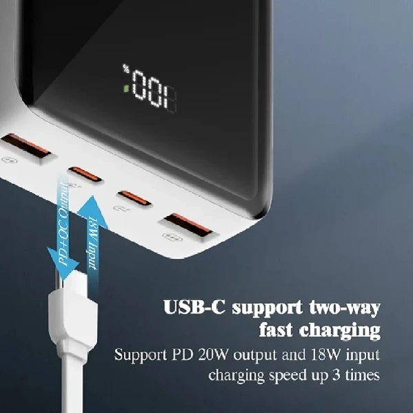 ورودی و خروجی چندگانه: با داشتن 5 پورت (2 درگاه ورودی و 3 درگاه خروجی)، این پاوربانک به شما امکان می دهد تا چندین دستگاه را به طور همزمان شارژ کنید.