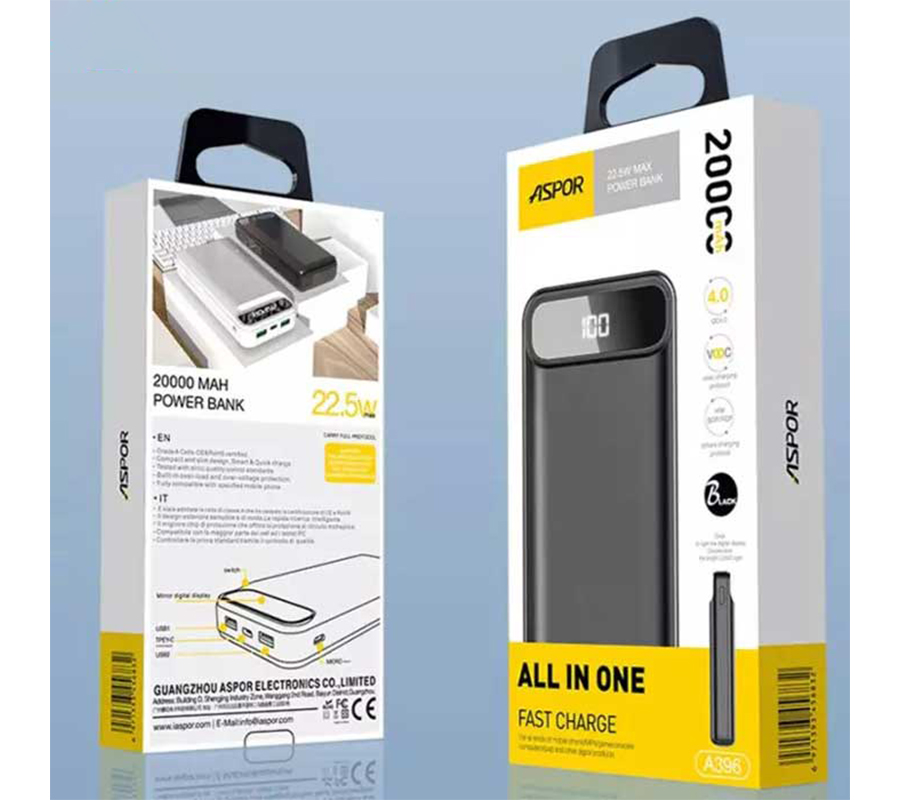 پاور بانک مدل A396 از ASPOR یکی از انواع پاور بانکهای قابل حمل است که برای شارژ دستگاههای الکترونیکی مانند تلفن همراه، تبلت و دیگر دستگاهها استفاده میشود. ظرفیت آن حدوداً 20000 میلی آمپر ساعت (mAh) است که به اندازهی کافی برای شارژ چند بارهی تلفن همراهتان مناسب است.