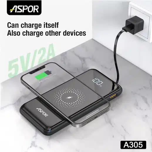پاوربانک Aspor A305 با قابلیت شارژ بی‌سیم، ظرفیت بزرگ، طراحی باریک و سیستم حفاظتی پیشرفته، انتخابی عالی برای کسانی است که به دنبال یک پاوربانک چندکاره و کارآمد هستند.