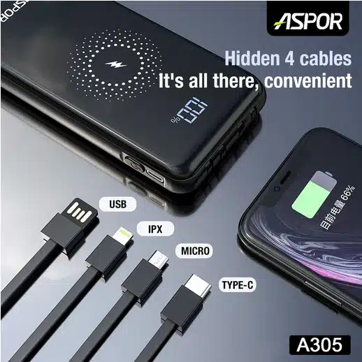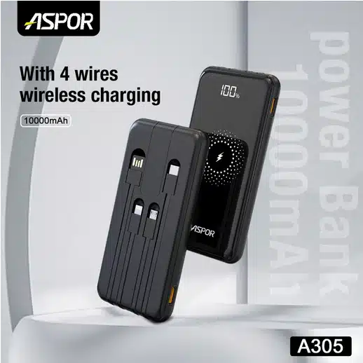 پاوربانک Aspor A305 با ظرفیت 10000 میلی‌آمپر ساعت، یکی از پیشرفته‌ترین پاوربانک‌های موجود در بازار است که علاوه بر امکانات متنوع، قابلیت شارژ بی‌سیم (وایرلس) را نیز ارائه می‌دهد. این ویژگی نوآورانه همراه با طراحی باریک و قابل حمل، آن را به گزینه‌ای عالی برای کاربران مدرن تبدیل کرده است.