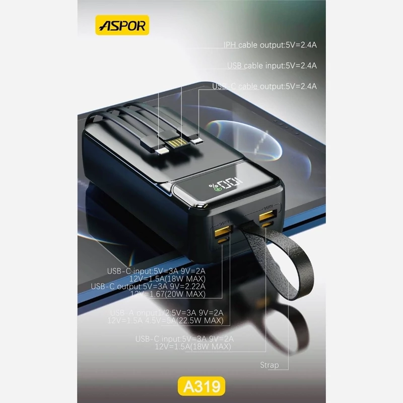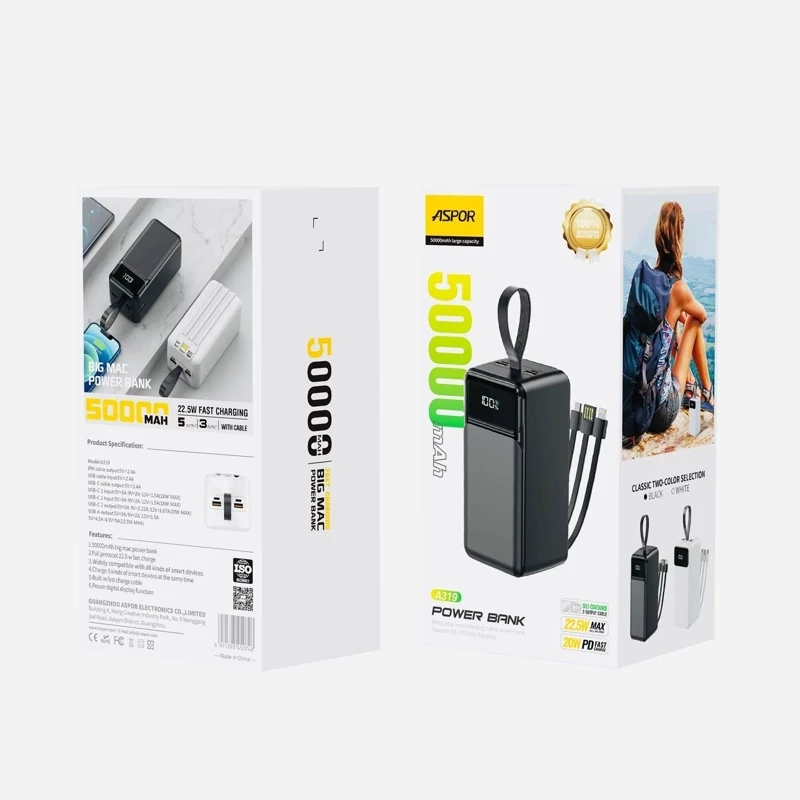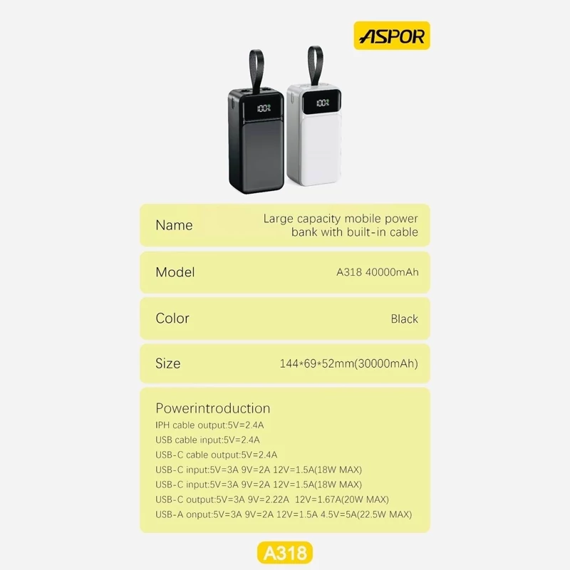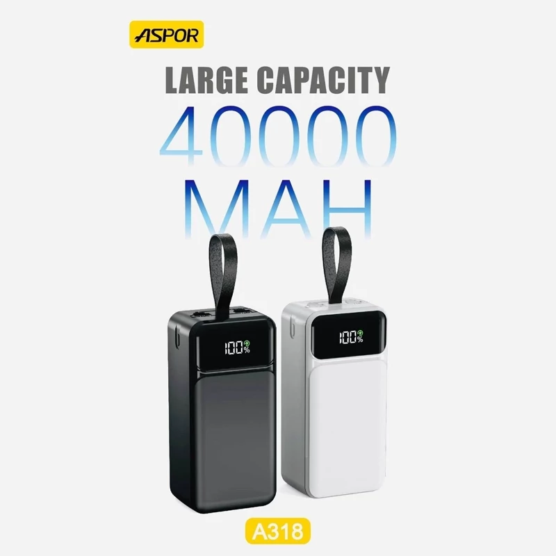 پاور بانک اصلی ASPOR A318 به گونه ای طراحی شده است که در حین حرکت، شارژ مطمئن و کارآمد را برای دستگاه های شما فراهم کند. این پاوربانک با ظرفیت باتری عظیم 40000 میلیآمپر ساعتی و شارژ سریع 22.5 واتی، تضمین میکند که شما برای مدت طولانی روشن بمانید. در اینجا ویژگی ها و مشخصات کلیدی وجود دارد:
