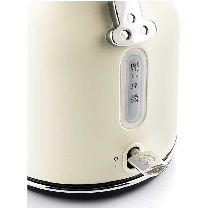 بدنه کتری از استیل ضدزنگ با کیفیت بالا و روکش رنگی مقاوم در برابر حرارت ساخته شده است. این متریال هم مقاوم است، هم زیبایی چشمنوازی دارد و هم بهراحتی تمیز میشود. نوار کرومی در لبهها و پایه نیز به زیبایی ظاهری افزوده است و حس لوکس بودن را تقویت میکند.
